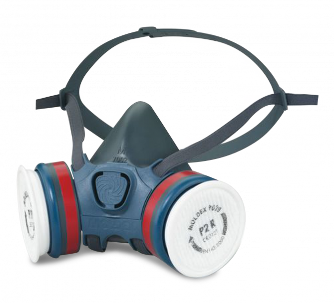 En halvskyddsmask från Vola med dubbla filter av högkvalitet. Masken har två patroner med ABE1P3R-kvalitet för skydd när du vallar med varm valla.